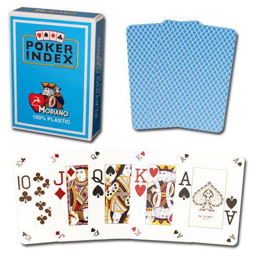 Kvalitní pokerové karty ze 100% plastu oblíbené značky Modiano. Karty mají klasický širokoúhlý formát, jsou 8,89 cm vysoké a 6,35 cm široké. Karty jsou čtyřrohé MINI- tedy ve všech rozích je uvedena hodnota karty a liší se tím, že u MINI provedení je index v rozích v menším provedení. Modiano karty jsou velice oblíbené u pravidelných hráčů pro svou vysokou životnost a odolnost. Díky složení ze 100% plastu vydrží tyto karty 100 krát více her než karty papírové nebo pouze s plastovým potahem. Karty jsou omyvatelné, vodotěsné a pyšní se svou dlouhou životností.